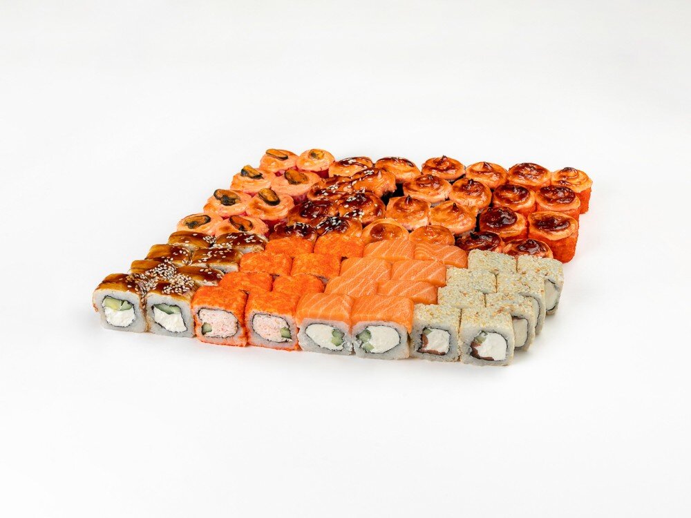 Филадельфия классик. кана. аляска с лососем. калифорния. запеченные роллы с мидии. с лососем. с креветкой. с угрем